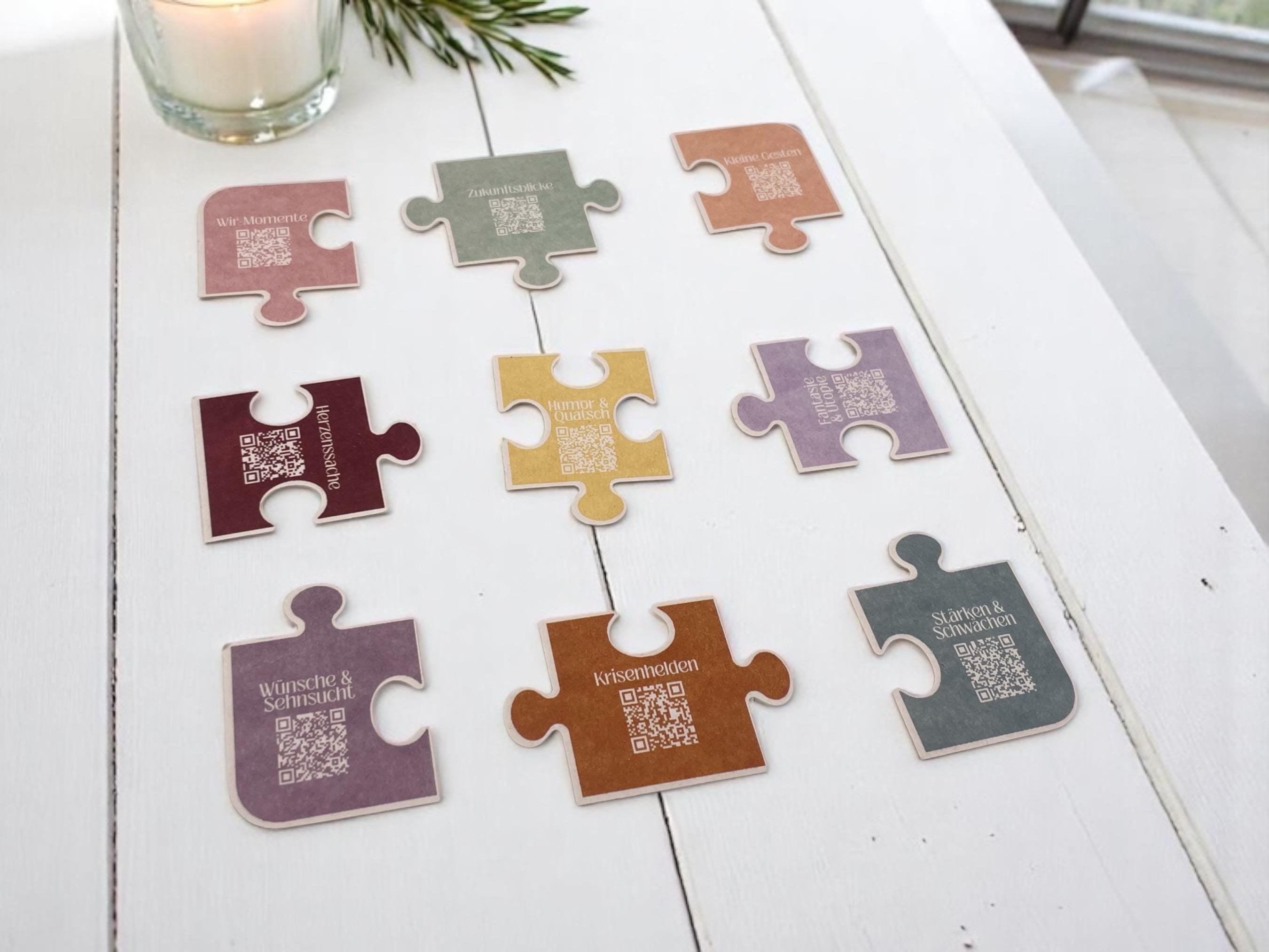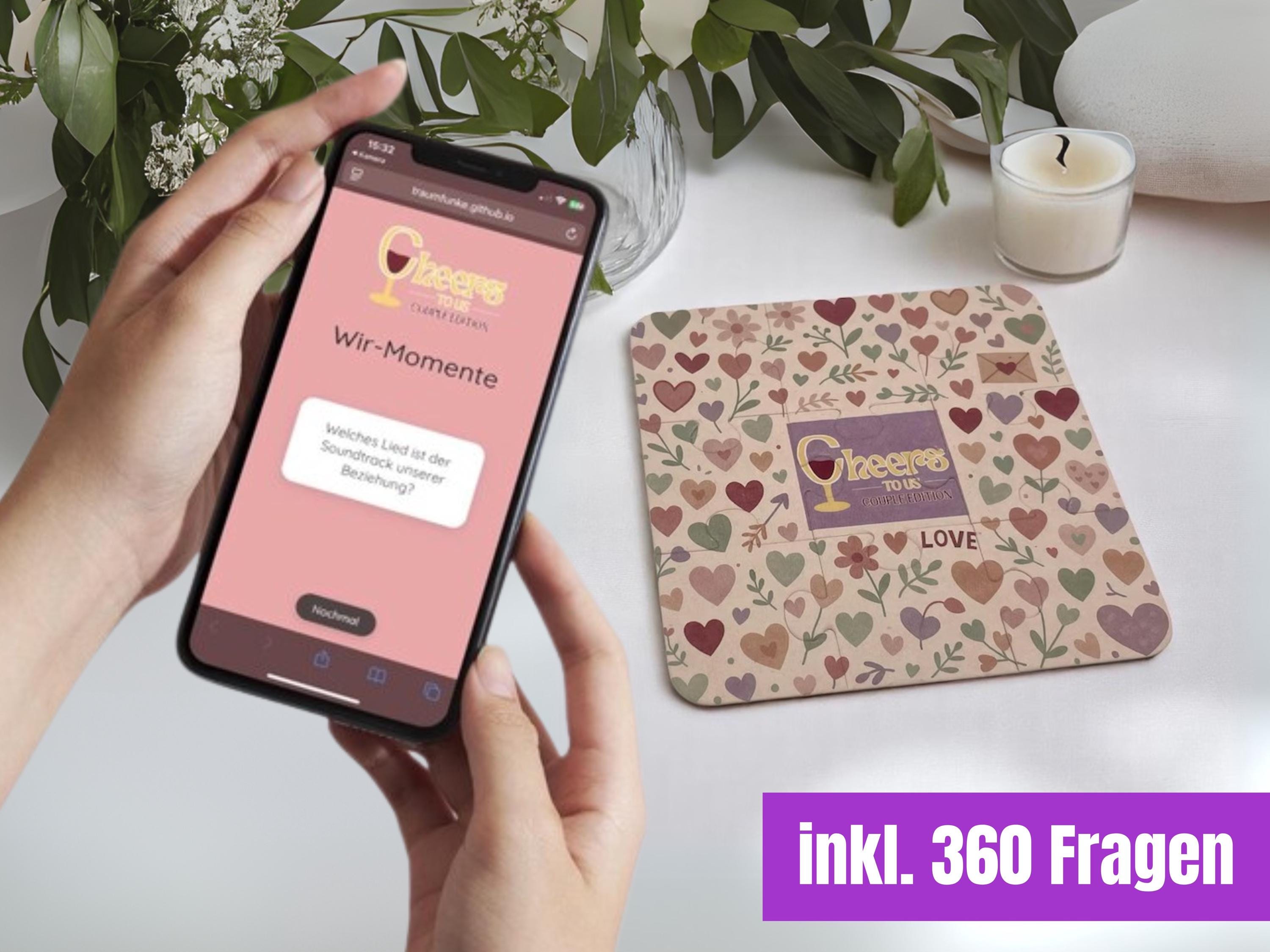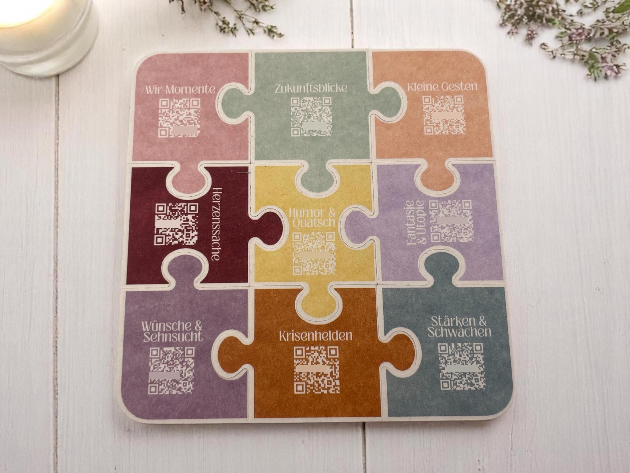 Jedes der 9 hochwertigen Bierdeckel-Puzzleteile trägt ein eigenes Thema rund um eure Beziehung. Auf der Rückseite führt euch ein QR-Code auf eine Webseite, wo euch ein Zufallsgenerator Fragen aus dem jeweiligen Themenbereich zeigt. So bleibt es abwechslungsreich und spannend, auch über viele Abende hinweg.