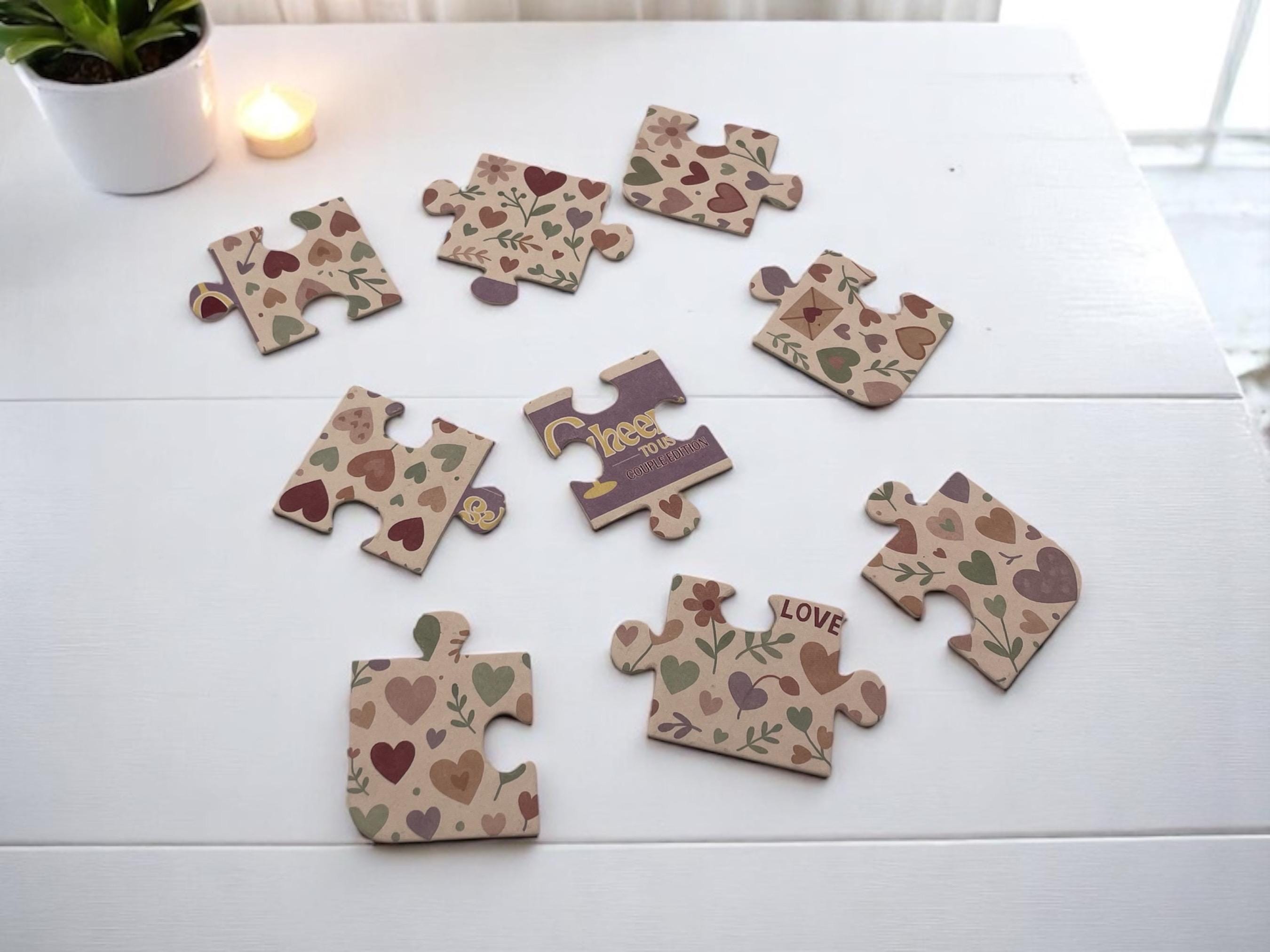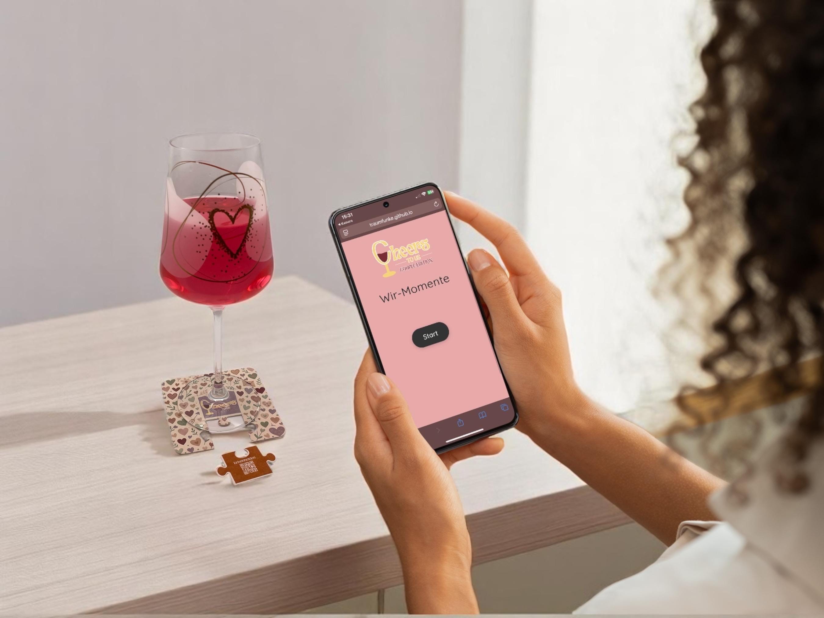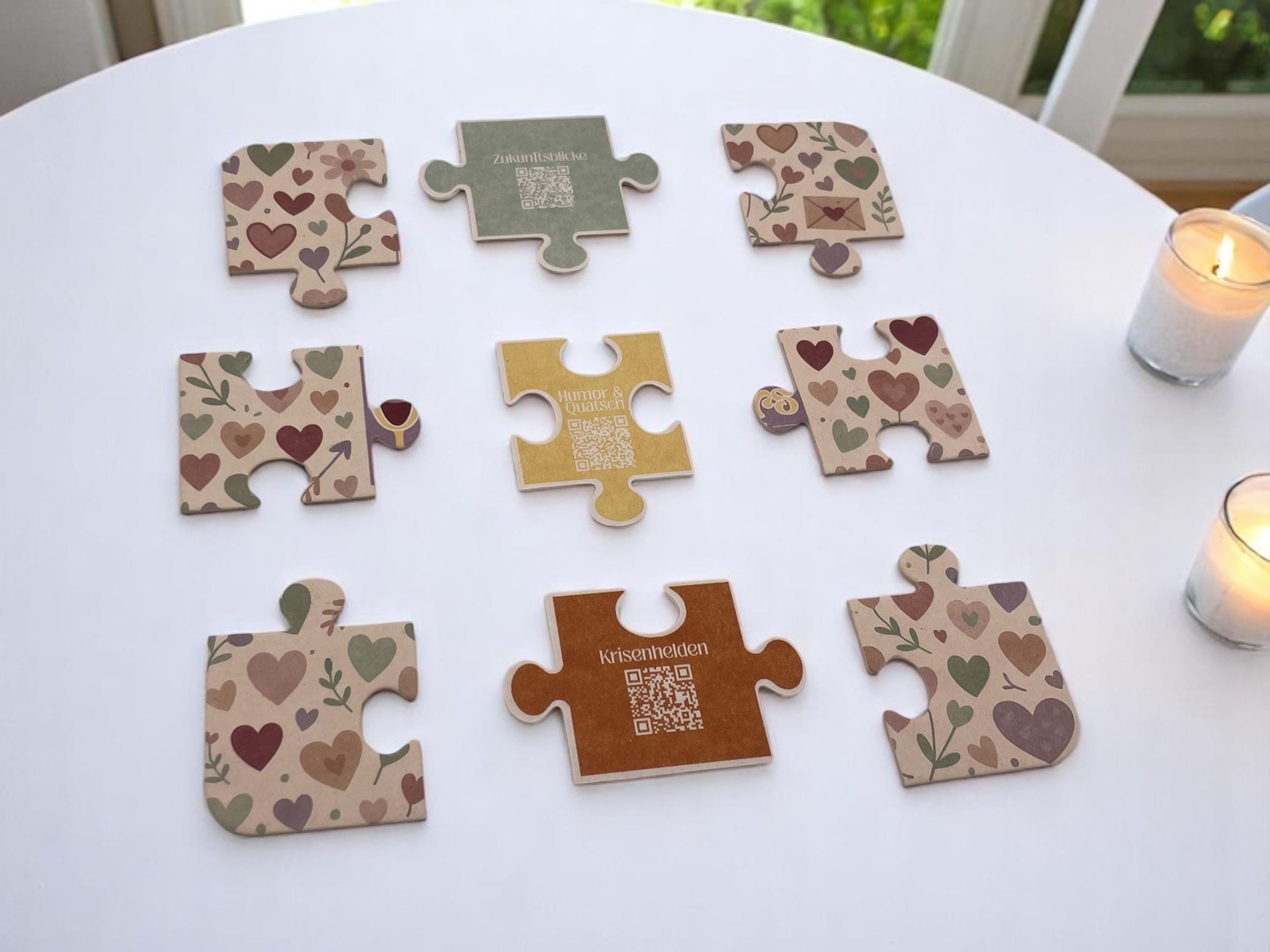 Jedes der 9 hochwertigen Bierdeckel-Puzzleteile trägt ein eigenes Thema rund um eure Beziehung. Auf der Rückseite führt euch ein QR-Code auf eine Webseite, wo euch ein Zufallsgenerator Fragen aus dem jeweiligen Themenbereich zeigt. So bleibt es abwechslungsreich und spannend, auch über viele Abende hinweg.