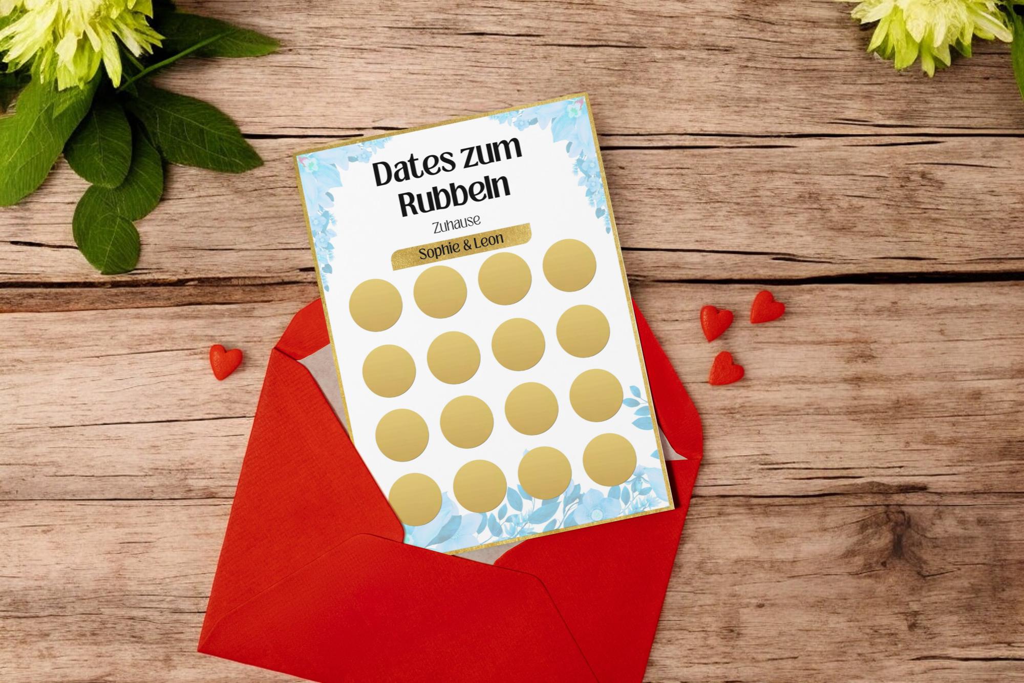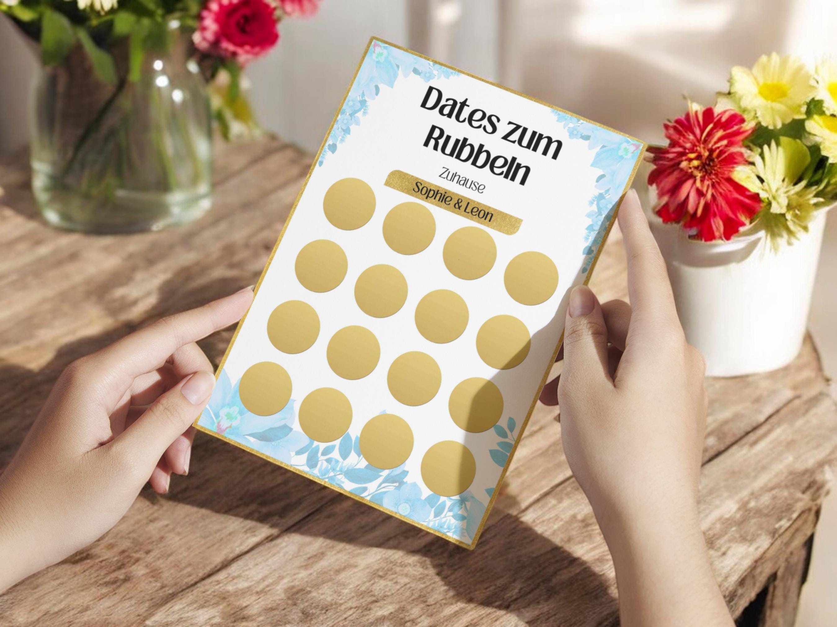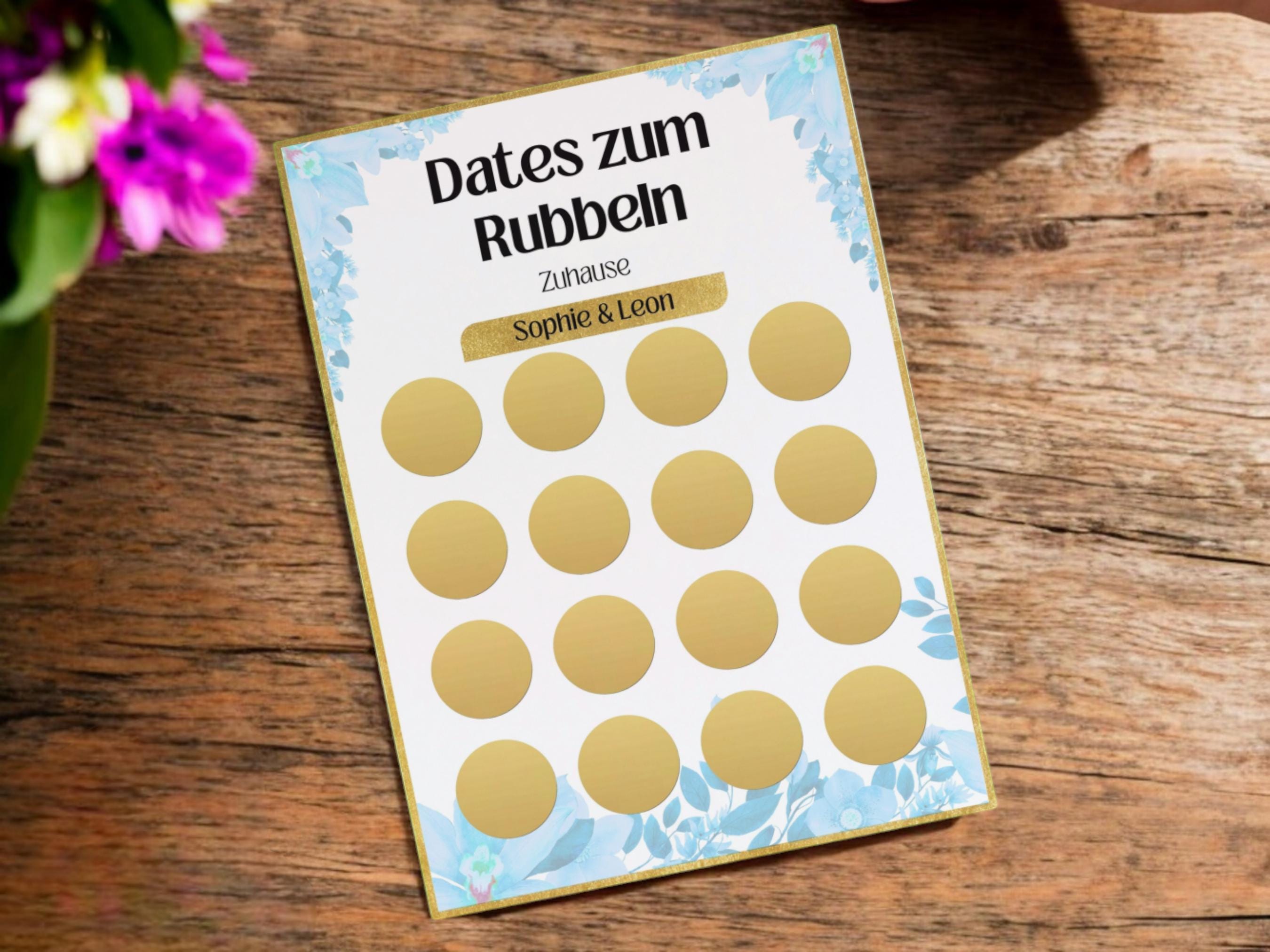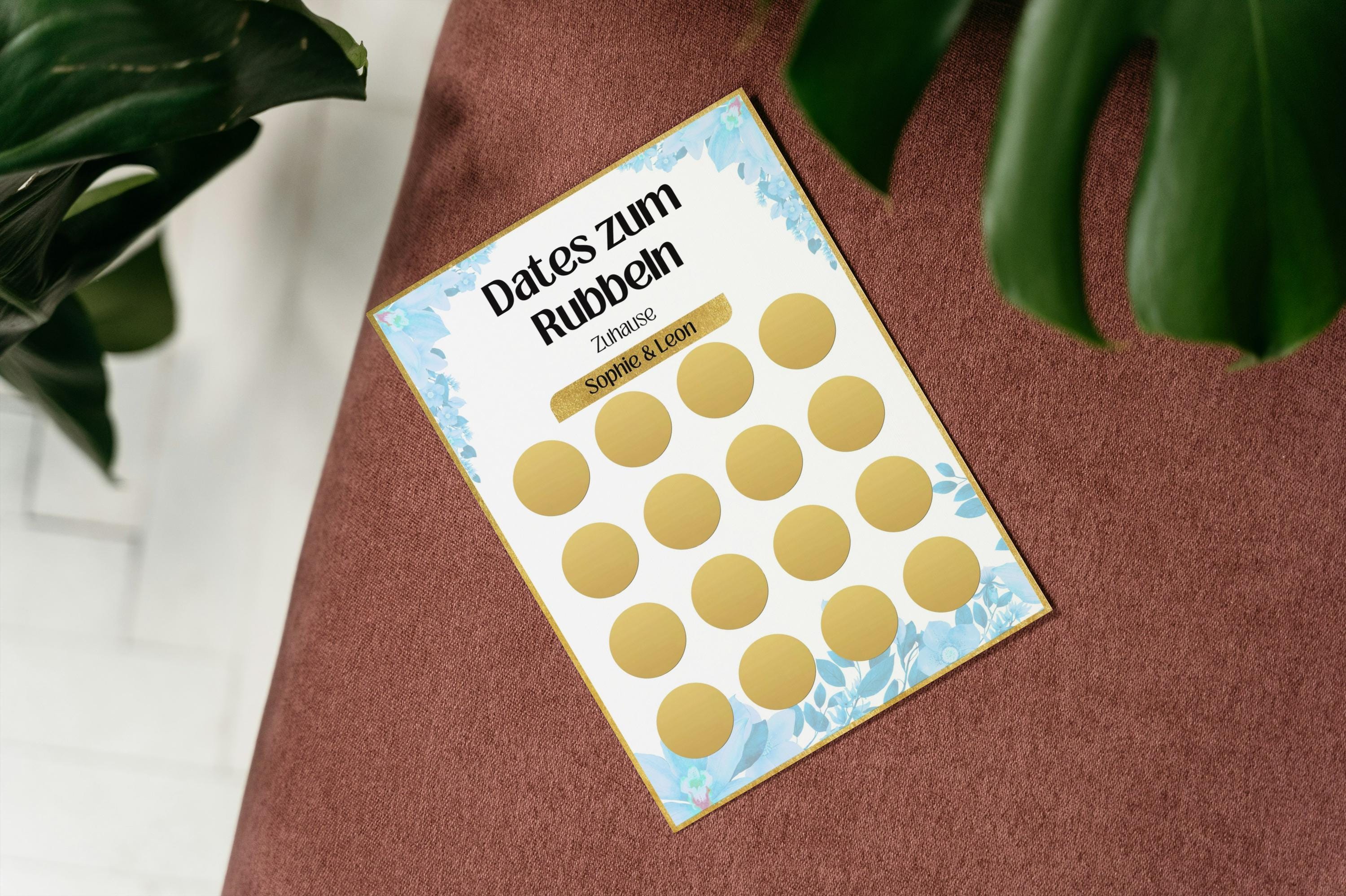 Entdecke die “Dates zum Rubbeln” – eine personalisierte Rubbelkarte mit 16 romantischen Zuhause-Date-Ideen, die speziell für Paare entworfen wurde. Diese einzigartige Karte bringt Abwechslung in eure Beziehung: Einfach ein Feld freirubbeln und euch erwartet ein spannendes Erlebnis.