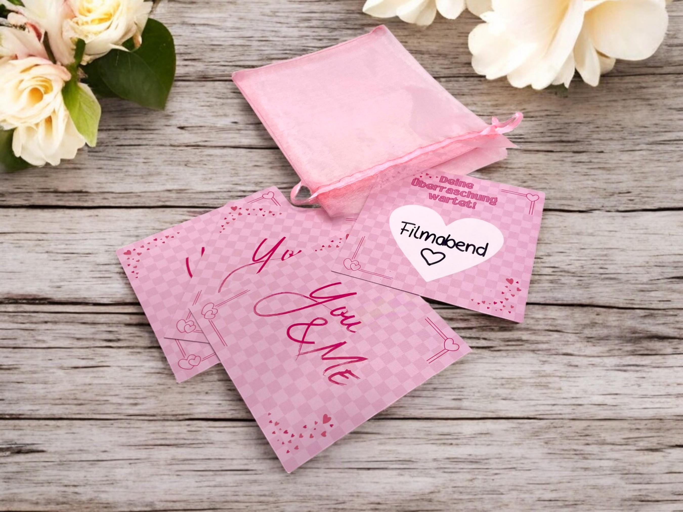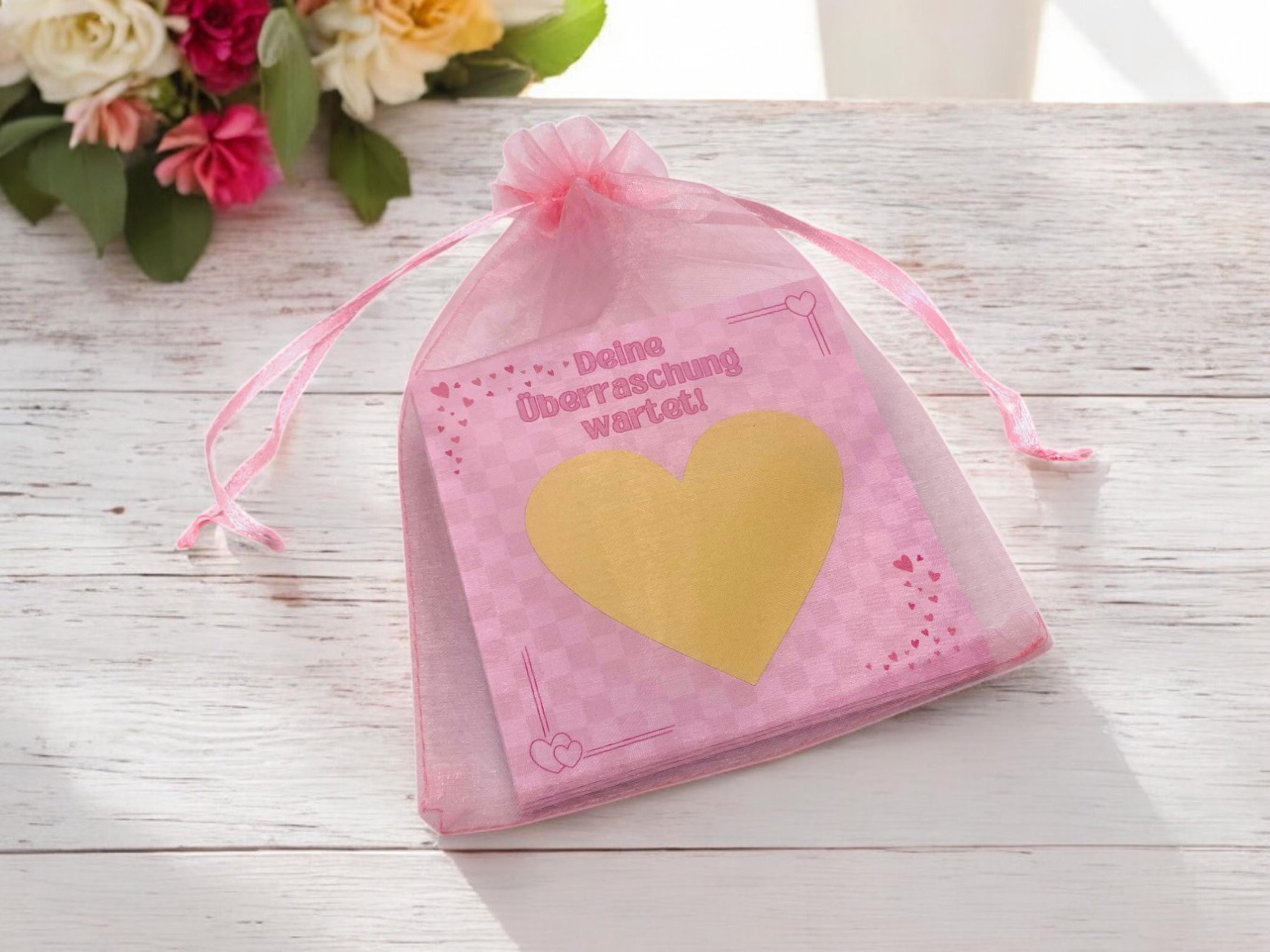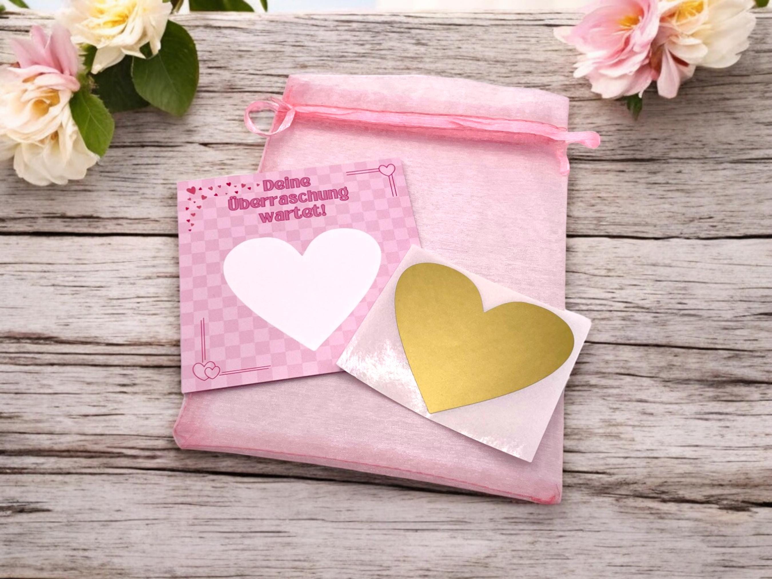 Jedes Set enthält je nach Wahl 5, 8 oder 10 Gutscheine, die beidseitig bedruckt sind. Zusätzlich bekommst du passende Herz Rubbel Sticker und einen edlen pinken Organza-Beutel zur Aufbewahrung.