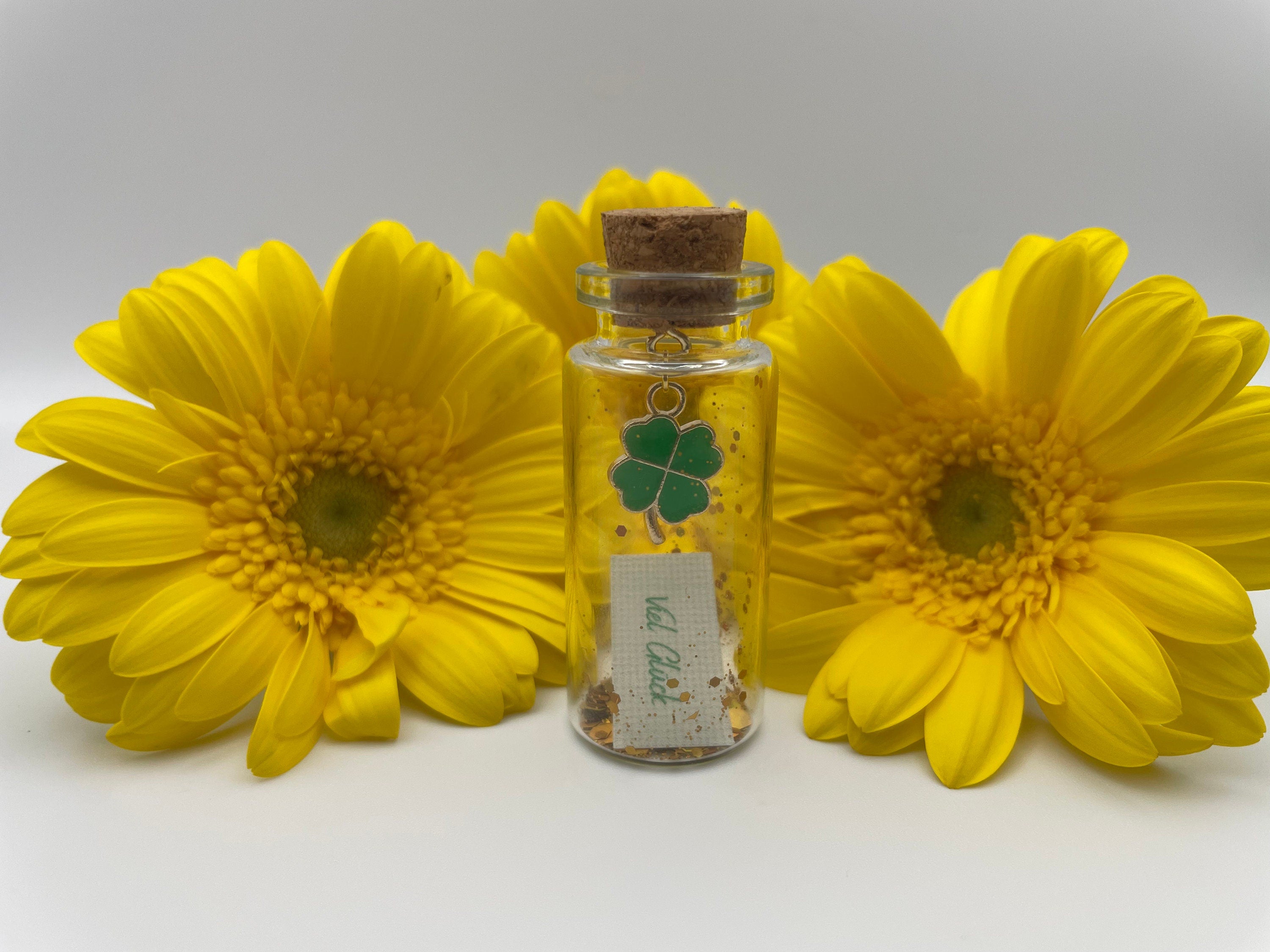 Überrasche deine Liebsten auf zauberhafte Weise mit unserer Mini Flaschenpost, die voller Glück und Freude steckt. In einem winzigen Glas ruht ein zartes Kleeblatt - das Symbol für Glück - wahlweise in hellgrün oder dunkelgrün. Den Glücksbringer erhältst du zusammen mit einem Zettel, auf dem du eine von drei zur Auswahl stehenden Botschaften überbringen kannst.