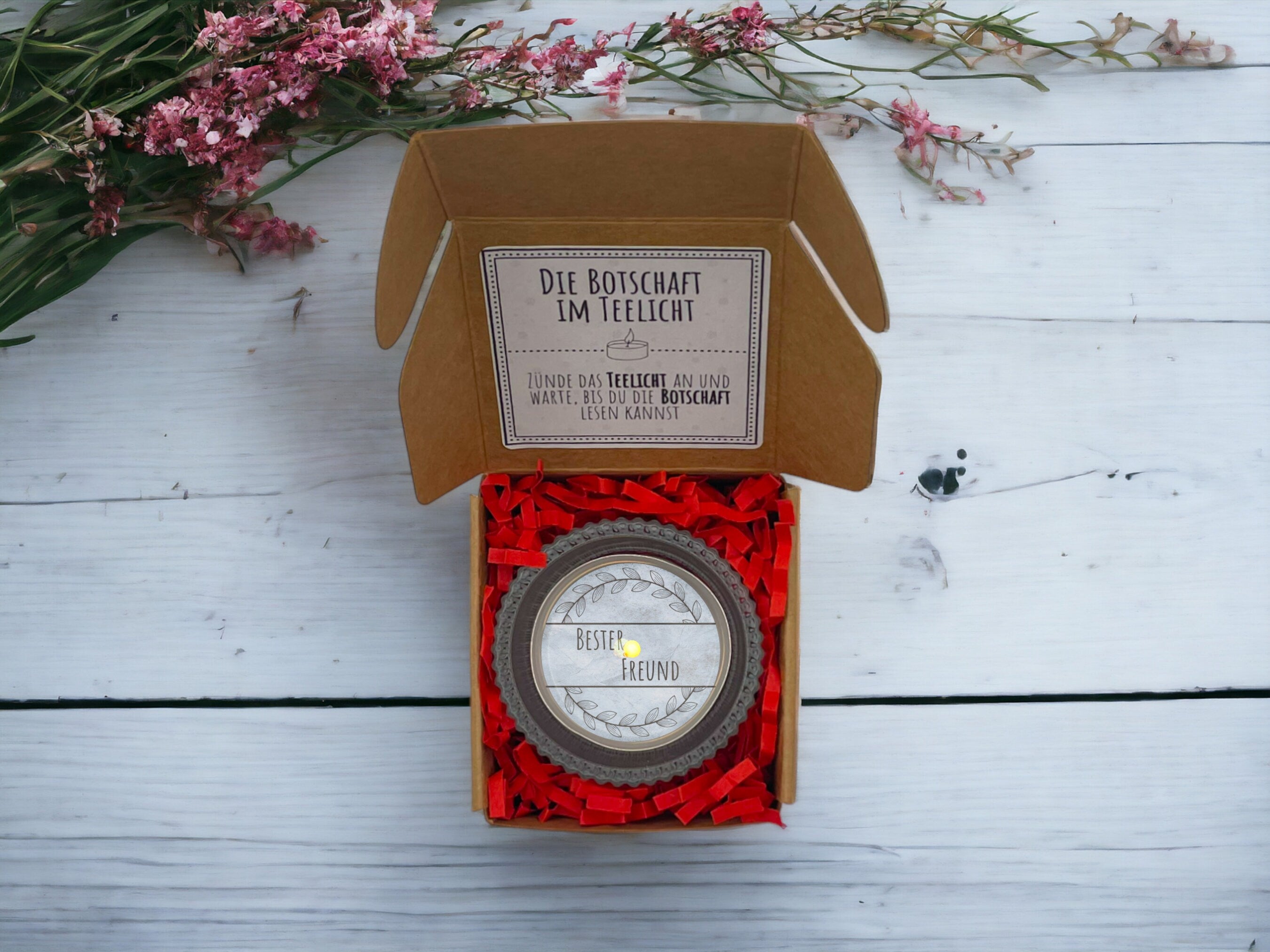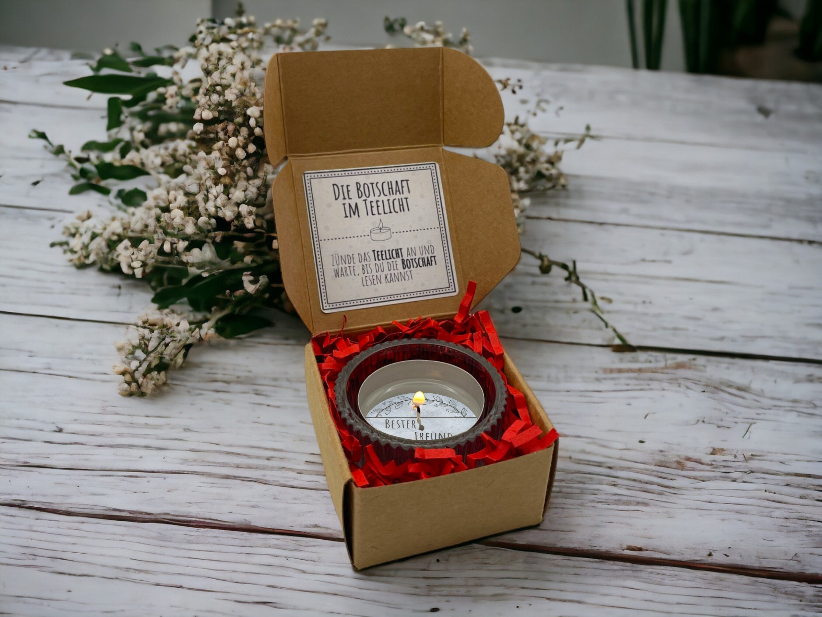 Unser Teelicht mit Botschaft ist das perfekte Accessoire für eure nächste Date Night oder ein romantisches Abendessen zu zweit. Es ist mehr als nur eine Kerze – es ist eine Liebeserklärung, die sich erst nach und nach offenbart. Während das Wachs langsam schmilzt, kommen herzerwärmende Botschaften wie „Ich liebe dich“ oder „Danke, dass es dich gibt“ zum Vorschein.